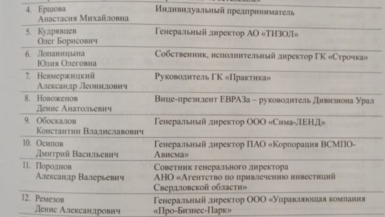 Часть из нововведенных бизнесменов предложены сразу в президиум совета. Среди них — гендиректор «Россети Урал» Владимир Болотин, руководитель дивизиона «Урал» ЕВРАЗа Денис Новоженов, гендиректор корпорации «ВСМПО-Ависма» Дмитрий Осипов, председатель Уральского банка Сбербанка Денис Суховерхов, вице-президент ПАО «Ростелеком» Сергей Гусев, директор застройщика Prinzip Геннадий Черных и гендиректор ООО «ФОРЭС» Сергей Шмотьев.