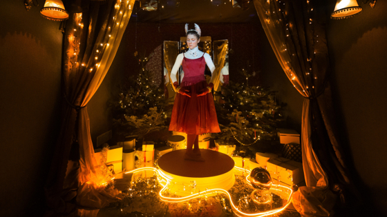 Музыкальная шкатулкаЗа несколько дней до Нового года двери лифта «Авиапарка» открылись как створки музыкальной шкатулки. Внутри зритель увидел праздничную картину: под музыку Чайковского декорации небольшой сцены озаряются светом, а балерина, похожая на живую статую, в такт кружится на подиуме.