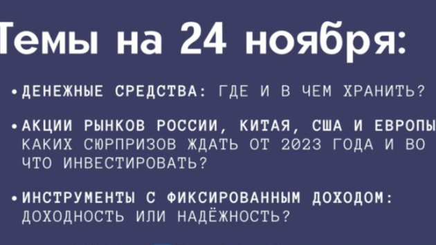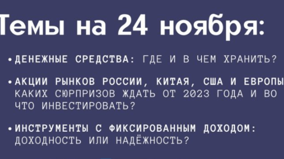UnitedAdvisors — проект с аккредитацией в ЦБ для всех, кто погружен в тему инвестиций. Основатели проекта собрали лучшую независимую экспертизу от ведущих советников на рынке, проверили её на риски и упростили для восприятия обычными инвесторами. С 24 ноября UnitedAdvisors запускает цикл тематических встреч, посвящённых новой реальности, в которой рынки живут уже 9 месяцев. На онлайн-вебинарах вы узнаете о том, что делать с деньгами, сможете обсудить перспективы и подходы к формированию инвестиционных портфелей и задать вопросы. Ближайшая онлайн-встреча состоится 24 ноября 2022 в 19:30. Спикер — Антон Затолокин, экс-начальник управления анализа рынков «Открытие Инвестиции». Просим подтвердить ваше участие по ссылке: https://t.me/c/1504020392/104 Задать уточняющие вопросы и оставить заявку можно у менеджера: @UnitedAdvisors Подписывайтесь на канал, там много полезной информации: https://t.me/united_advisors