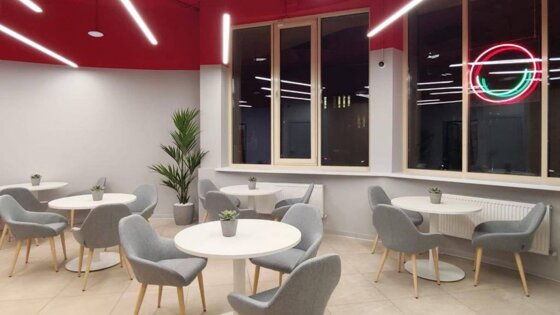 Дизайн офиса выполнен в современном стиле с учетом необходимых условий для комфортного обслуживания клиентов и ломает представление о классическом отделении банка. Пространство организовано в свободной планировке и напоминает больше коворкинг или уютное кафе, где клиенты располагаются в удобных мягких креслах за круглыми столиками.