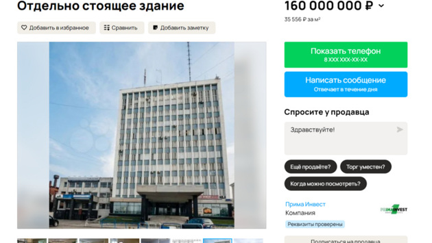«На продаже нежилое помещение в центре города, район ЖД вокзала. [Продаются] девять первых этажей в 11-этажном здании [за] 160 000 000 рублей», — говорится на сайте объявлений «Авито». Стоимость бизнес-центра в октябре прошлого года составляла 180 миллионов рублей.