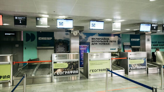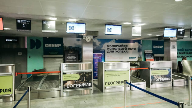 В тюменском аэропорту «Рощино», забрендировали 35 метровую стену за стойками регистрации.