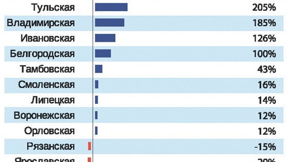 Остальные нестоличные регионы ЦФО расположились в этом рейтинге следующим образом: Курская область - 3,524 миллиарда рублей, Ивановская - 1,973, Тульская - 1,264, Калужская - 984 миллиона рублей, Тамбовская - 891, Рязанская - 794, Брянская - 713, Тверская - 410, Смоленская и Тамбовская - по 220, Орловская - 219, Костромская - 183, Владимирская - 59.
