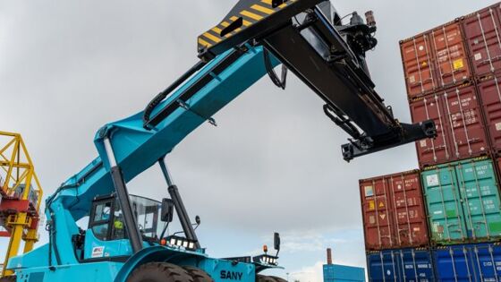 Контейнерный перегружатель китайской марки SANY обладает грузоподъёмностью 45 тонн. Он оснащён двумя электродвигателями общей мощностью 330 кВт и аккумуляторными батареями ёмкостью 507 кВт·ч.
