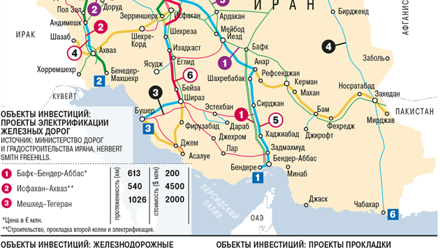 Доля транспорта в ВВП Ирана составляет 7%. В стране 220 тыс. км автомобильных и 13 тыс. км железных дорог, 11 торговых портов. Иранские железные дороги (RAI) перевозят порядка 33 млн тонн грузов и 28 млн пассажиров в год. По данным Министерства дорог и городской инфраструктуры Ирана, ежегодная потребность в инвестициях в автодороги составляет $3 млрд, в железные дороги и сухие терминалы — $2 млрд, в портовый бизнес — по $1 млрд. По оценке вице-президента RAI Бабека Ахмади, в ближайшие семь лет стране потребуется 27 тыс. грузовых и 3 тыс. пассажирских вагонов, около 1 тыс. локомотивов. Собственный производственный потенциал при этом порядка 3 тыс. грузовых вагонов и 50–60 локомотивов в год. Железнодорожная сеть в Иране начала развиваться только в 1887 году, а первые относительно протяженные линии появились во время Первой мировой войны. Ускоренное развитие началось только в 1920–1930-х годах при Резе Пехлеви, когда в том числе была построена Трансиранская железная дорога из каспийского порта Торкеман в сегодняшний порт Бендер-Хомейни. Но железные дороги все еще недоразвиты, на них приходится лишь 11% пассажиропотока, 65–70% грузов перевозят автомобили. Накануне отмены санкций Иран объявил о масштабном привлечении инвестиций в железные дороги, обещая раздать проекты на $25 млрд. Инвесторы уже встали наизготовку. В начале января Siemens, который до 2010 года работал с местной группой MAPNA, подписал меморандум о взаимопонимании с RAI об участии в проекте электрификации железной дороги Тегеран—Мешхед и строительстве ВСМ Тегеран—Исфахан. Меморандум о взаимопонимании в области городского и наземного транспорта и протокол о сотрудничестве в сфере железных дорог подписал французский Alstom. Итальянская FS возобновила сотрудничество с RAI, ее дочерние структуры участвуют в проектировании 400 км линии Тегеран—Кум—Исфахан. Еще в 2014 году власти Ирана заключили контракт с консорциумом китайских CMC и SU Power и структурами MAPNA на поставку электрооборудования и 70 локомотивов. В 2015 году Иран и КНР подписали соглашение, по которому 85% от стоимости проекта (€1,9 млрд) будет профинансировано за счет китайских займов. Россия в инфраструктурных проектах в определенной степени сохраняла партнерство с Ираном и до снятия санкций. ОАО РЖД в 2008–2012 годах электрифицировало линию Тебриз—Азаршахр. Но год назад началось заметное оживление сотрудничества в транспортной сфере. В отличие от ряда других направлений здесь видно реальное продвижение проектов, однако общая закономерность сохраняется: положительная динамика наблюдается там, где партнер Тегерана сам привлекает финансирование. Так, 13 декабря 2016 года в Тегеране правительства обеих стран подписали соглашение о предоставлении Россией экспортного кредита Ирану на электрификацию железнодорожного участка Гармсар—Инче-Бурун (495 км). Этот кредит был согласован еще в феврале 2016 года, он не превысит €1 млрд — средства будут предоставлены под 2,77% годовых в евро или рублях по желанию иранской стороны и должны быть погашены в течение пяти лет после окончания пятилетней выборки кредитов (начало должно произойти не позднее февраля 2024 года). К участию в проекте Иран пригласил ОАО РЖД еще до снятия санкций, в 2014 году, а в ноябре 2015 года «РЖД Интернешнл» и RAI заключили контракт на проектирование, строительство и поставку материалов и оборудования