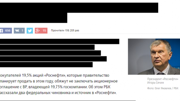 РБК сообщил, что выполнил требование суда, удалил фрагменты из апрельской статьи, повлекшей иск «Роснефти», и опубликовал опровержение этих сведений. Портал напоминает, что в статье от 11 апреля 2016 г. суд признал не соответствующими действительности и порочащими деловую репутацию «Роснефти» заголовок, лид-абзац, а также еще один фрагмент. РБК их процитировал и сообщил, что удалены из текста статьи. Поводом для иска «Роснефти» стала статья о подготовке к приватизации «Роснефти». Ее авторы Тимофей Дзядко, Людмила Подобедова и Максим Товкайло со ссылкой на анонимные источники в правительстве утверждали, что одним из условий продажи приватизируемого пакета было требование, чтобы покупатель не заключал акционерное соглашение с BP, владеющей 19,75% «Роснефти». Ответчиками по иску кроме холдинга РБК стали и авторы статьи. «Роснефть» назвала статью «ложной», заявив, что она «представляет собой ни на чем не основанные фантазии журналистов или их так называемых источников», и потребовала опровержения, а также 3,18 млрд руб. компенсации ущерба деловой репутации, беспрецедентную сумму в российской юридической практике. Суд первой инстанции признал информацию в статье недостоверной, но снизил требуемую сумму компенсации до 390 000 руб. Вторая инстанция вовсе ее отменила.