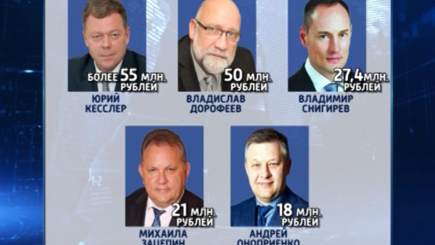 Верхнюю строчку в рейтинге занимает генеральный директор компании «Лукойл-Калининградморнефть» Юрий Кесслер. В 2016-м его доходы превысили 55 миллионов рублей. Следом идет руководитель «Калининградского морского торгового порта» Владислав Дорофеев, у которого на пять миллионов меньше. Замыкает тройку самых высокооплачиваемых народных избранников председатель комитета по экономике и финансам Владимир Снигирев с суммой 27,4 миллиона рублей. Генеральный директор «Калининградского янтарного комбината» Михаил Зацепин с 21 миллионом рублей занял четвертую позицию. На пятой строчке Андрей Оноприенко, его доход составил 18 миллионов рублей.