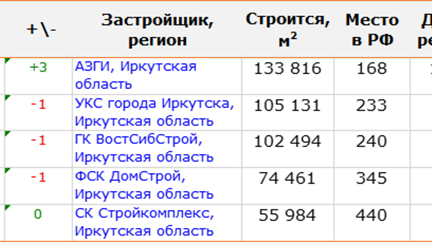 Опубликованы обновленные данные ТОП застройщиков по текущему строительству в регионах Российской Федерации. По состоянию на 1 июля 2017 года произошла смена лидеров ТОП в 3 регионах: ТОП по Иркутской области возглавил застройщик , который потеснил с первого места компанию . Застройщик АЗГИ увеличил объем строящегося жилья с 57 385 м2 до 133 816 м2. Доля этого застройщика в регионе составляет 12,34 %. ТОП-5 застройщиков Иркутской области по текущему строительству на 1 июля Лидером ТОП по Курской области стал застройщик . Прежний лидер ТОП, компания , сместился на второе место. ТОП-5 застройщиков Курской области по текущему строительству на 1 июля Застройщик , занял пьедестал в своем регионе за счет увеличения объема строящегося жилья с 16 281 м2 до 29 673 м2. ТОП застройщиков Чеченской республики по текущему строительству на 1 июля Полные данные по ТОП застройщиков по текущему строительству в РФ доступны по .