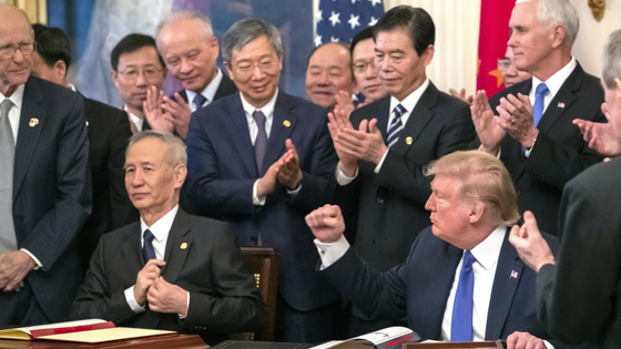 На исходе второго часа церемонии слово наконец предоставили китайскому гостю. Вице-премьер Лю Хэ зачитал письмо председателя Си: "Соглашение выгодно Китаю, а также США и всему миру. Это показывает, что наши страны способны выстраивать хорошие взаимоотношения, которые будут содействовать отстаиванию глобального мира, стабильности и процветанию".