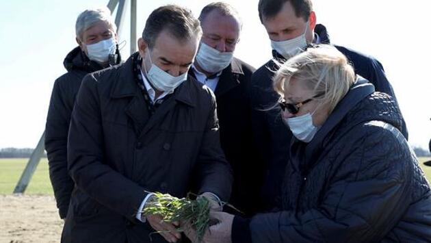 Глава администрации (губернатор) Краснодарского края Вениамин Кондратьев с рабочей поездкой побывал в Калининском районе. Он посетил ведущее предприятие муниципалитета — племзавод «Дружба», поля которого под будущий урожай засеяны преимущественно кубанскими сортами. Глава региона вместе с вице-губернатором Андреем Коробкой и специалистами сельского хозяйства осмотрел состояние озимых. Под урожай этого года на предприятии посеяно более 1,7 тысячи гектаров озимой пшеницы и боле 160 гектаров ячменя. За счет краевой господдержки в хозяйстве закупили семена, в том числе элитных сортов. На сельхозпредприятии используют только лучшие кубанские сорта 7—8 видов. Сеют их в сжатые сроки, своевременно внося органические удобрения. Для посева и уборки предприятие обеспечено необходимой техникой. По результатам прошлого года рентабельность хозяйства составила почти 85 процентов. Более 70 тонн составил общий урожай. Глава региона подчеркнул, что залог больших урожаев — использование научного подхода и инноваций в аграрной сфере. Без этого сегодня невозможно развитие агропромышленного комплекса. Как отметил Вениамин Кондратьев, именно благодаря активному взаимодействию с кубанскими учеными в прошлом году, несмотря на засуху, удалось собрать достойный урожай. И сейчас состояние большинства посевных площадей не вызывает опасений. Было озвучено, что площадь сева под урожай 2021 года озимых колосовых культур в Краснодарском крае составляет порядка 1,8 млн гектаров. Из них около 1,6 млн гектаров — озимая пшеница. Состояние озимых колосовых культур на 63 процентах засеянной площади оценивается как хорошее. Как удовлетворительное — на 37 процентах. Селяне приступили к подкормке озимых. В целом на сегодняшний день в хозяйствах края удобрения внесены на 332 тысячах гектаров, что составляет почти 20 процентов от запланированного. В Калининском районе Вениамин Кондратьев провел предпосевное совещание, на котором отметил, что прошлый год был непростым с точки зрения климатических условий, самым засушливым за последнее время. — Мы успели где-то перестроиться, но где-то оказались не готовы. Аграрии убедились в необходимости страховать посевы. В прошлом году на каждый потраченный на агрострахование рубль они получили двадцать рублей на возмещение убытков,— сказал губернатор. Говоря о финансировании отрасли АПК, он уточнил: — Мы увеличили поддержку АПК почти на 500 млн рублей. В целом финансирование отрасли в этом году составит 8 млрд рублей, из них 3 млрд пойдет на растениеводство. Причем в приоритете при распределении субсидий будут аграрии, которые взаимодействуют с кубанскими учеными. Только в этом случае бюджетные инвестиции будут работать качественно, возвращаться в виде рекордных урожаев и новых производств. Вениамин Кондратьев также отметил, что бюджетные средства направят в том числе на субсидирование производства масличных культур в рамках нацпроекта «Международная кооперация и экспорт». Финансирование этого направления в сравнении с 2020 годом увеличилось более чем в два раза. Губернатор акцентировал внимание участников предпосевного совещания на том, что в крае нужно увеличивать посевы сои и рапса, загружать перерабатывающие предприятия. — Выгоден как экспортная культура рапс, который созревает раньше подсолнечника, рапсово