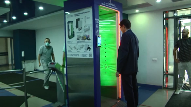 «В отличие от установки прошлого поколения — это новое устройство способно не только дезинфицировать одежду, а также удаленно определять температуру человека, но и обладает встроенным металлодетектором. Красный сигнал обозначает, что человек пронес через рамку металлический предмет, и мы видим, что это действительно так — в данном случае это микрофон».