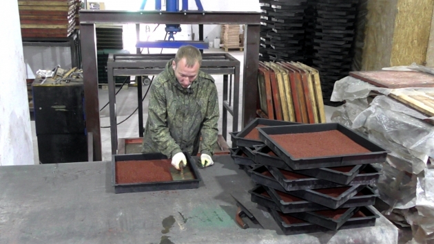 В производственном цеху предприятия кипит работа: каждые 25 минут на четырехчасовую сушку в хранилище уезжает паллета с 5 квадратными метрами резинового покрытия. Фармовщики работают без остановки: сначала засыпают в цистерну крошку, потом заливают в нее краситель и клей. Машина тщательно перемешивает все до однородной субстанции в течение 10 минут. Всё – основа для будущей плитки покрытия готова. Теперь рабочим предстоит быстро засыпать ее в форму, равномерно распределить, утрамбовать и отправить под пресс. Весь производственный цикл от засыпки крошки до извлечения плитки из формы после сушки занимает около 5 часов.