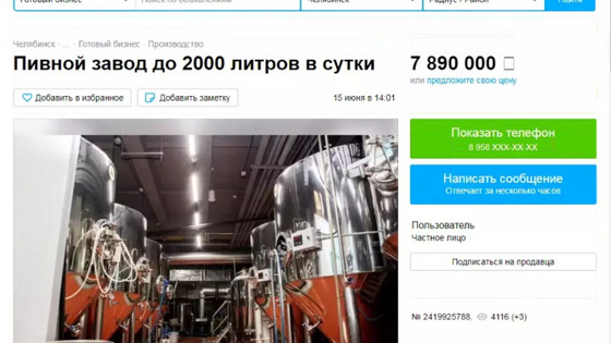 В Челябинске на популярном сайте объявлений продается мини-пивзавод почти за 8 млн рублей. По словам автора объявления, оборудование позволяет производить до 60 тыс. литров пива в месяц. Бизнес продается вместе с юридическим лицом.