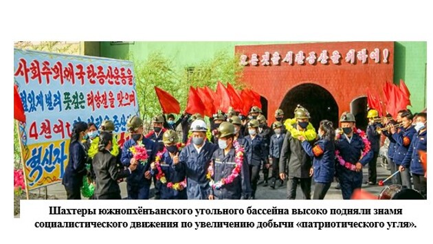 Шахтеры южнопхёнъанского угольного бассейна, высоко подняв знамя патриотического движения, увеличили добычу угля на 4000 с лишним тонн. Рабочие Хыннамского объединения химических удобрений произвели 2000 тонн удобрений сверх плана.