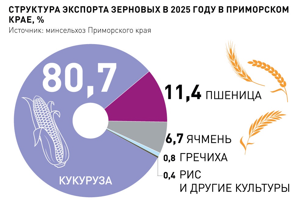 По итогам 2025 года в Приморском крае был задекларирован на экспорт рекордный объем зерновых культур - 791,8 тысячи тонн, что более чем на 60 процентов превышает показатель 2024-го. Несмотря на отдаленность от экономического центра России регион обладает выгодным положением, обусловленным близостью к рынкам стран АТР. По этой причине 88,3 процента экспортируемых зерновых культур из Приморья направляют в Азию. Лидерами по объему закупок являются Китай, который в основном импортирует соевые бобы и кукурузу, и Южная Корея - завозит кукурузу, пшеницу, овес. Продукцию агропромышленного комплекса поставляют также во Вьетнам (пшеница), Монголию (рис) и ряд других стран.
