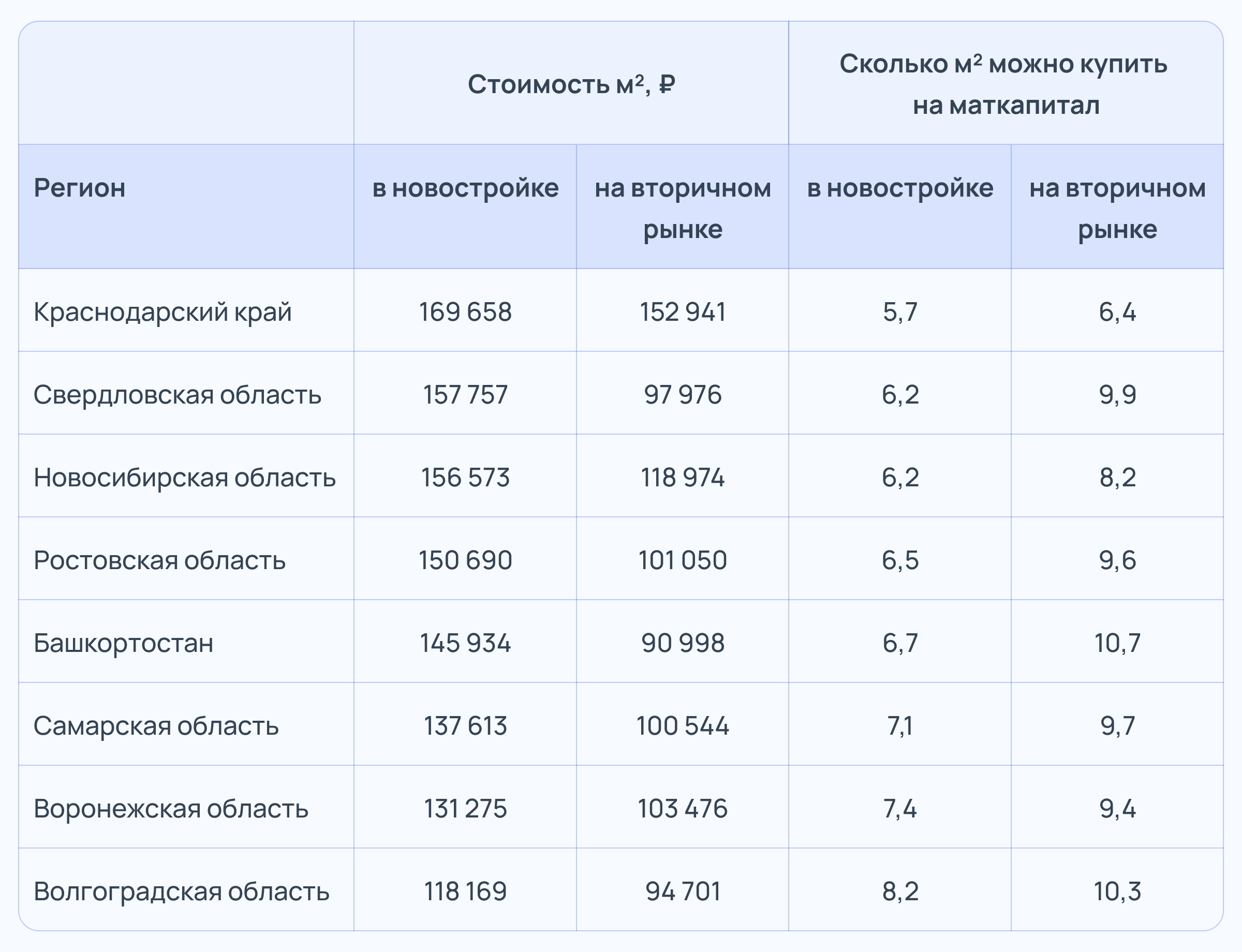 Согласно нашим расчётам, наибольшее количество квадратных метров жилья на средства материнского капитала можно приобрести в Воронежской и Волгоградской областях среди рассмотренных нами регионов: 7,4 и 8,2 — на первичном рынке и 9,4 и 10,3 — на вторичном рынке соответственно.