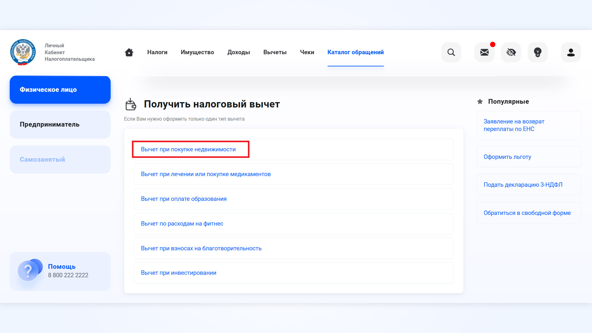 Вычет удобно оформить через личный кабинет на сайте ведомства. Это можно сделать в разделе «Вычет при покупке недвижимости». Достаточно заполнить все поля онлайн-формы, прикрепить документы и отправить заявку.