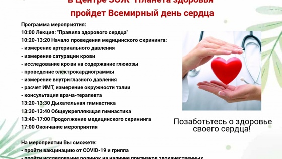 Участники акции смогут прослушать лекцию о правилах сохранения здорового сердца и пройти медицинский скрининг. Специалисты Центра медицинской профилактики и Центра здоровья городской поликлиники № 7 измерят желающим артериальное и внутриглазное давление, сатурацию, уровень глюкозы в крови, проверят работу сердца на кардиовизоре, рассчитают индекс массы тела и измерят окружность талии. Также нижегородцы смогут получить консультацию терапевта по коррекции выявленных факторов риска развития сердечных заболеваний.