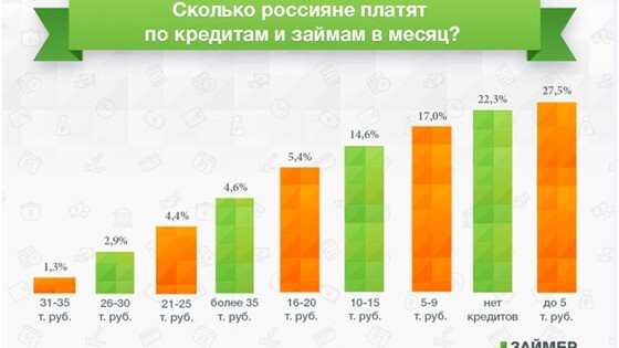 Россияне чаще всего платят по кредитам и займам до 5 тыс. рублей в месяц. Такая планка актуальна для трети жителей РФ. Еще 22,3% заявляют, что у них в принципе нет кредитов. 17% отметили, что ежемесячно относят в банк или микрофинансовую организацию от 5 тыс. до 9 тыс. рублей. Таковы результаты исследования сервиса онлайн-займов «Робот Займер». В опросе приняли участие порядка 10 тыс. совершеннолетних граждан по всей стране. «Таким образом, у 49,8% респондентов объемы ежемесячных выплат по кредитам и займам не превышают пяти тысяч рублей или равны нулю», — отмечают специалисты сервиса «Робот Займер», указывая, что опрошенные, скорее всего, в большинстве своем отвечали про беззалоговые кредиты. Следует указать, что свыше 35 тыс. рублей в месяц (самая высокая планка в опросе) отдают в оплату долговых обязательств около 5% россиян. «По данным статистики за 2016 год, 40% россиян имели зарплату до 19 тысяч рублей. Номинальная заработная плата за 2017 год выросла на 7,3%, поэтому данная категория граждан, можно полагать, получает сейчас порядка 20,5 тысячи рублей. То есть даже ежемесячные платежи в пять тысяч рублей при такой зарплате являются достаточно ощутимыми, — обращает внимание исполнительный директор сервиса онлайн-займов «Робот Займер» Данил Шерстобитов. — Кроме того, стремительно растет доля займов в МФО и POS-кредитовании, где суммы займов, а следовательно, и выплаты не являются большими в номинальном выражении. Помимо этого, сейчас заемщики становятся все более финансово грамотными, более объективно оценивают свои возможности и при необходимости сокращают кредитную нагрузку по максимуму». Продуктовый виджет С приведенной статистикой согласны и в других кредитных учреждениях. Впрочем, указывают эксперты, чем больше банк или МФО, тем в нем обычно больше средний ежемесячный платеж. «Для удобства наших заемщиков у нас введен еженедельный график платежей: платить чаще по чуть-чуть проще даже с точки зрения психологии, чем раз в месяц отдавать большую сумму. Однако если перевести эту сумму в ежемесячные платежи, то она не превышает 4,8 тысячи рублей в месяц (то есть средний еженедельный платеж составляет около 1,2 тысячи рублей). Как показала практика, это наиболее комфортная сумма для платежа в счет погашения займа для большинства клиентов, — рассказывает главный исполнительный директор МФК «Домашние деньги» Андрей Бахвалов. — Говоря о динамике роста, то средний ежемесячный платеж не претерпел никаких изменений за последний год». Новость По словам аналитика Хоум Кредит Банка Станислава Дужинского, сейчас из клиентов с действующим кредитом в «Хоум Кредите» 42% платят менее 5 тыс. рублей в месяц. Их доля постепенно растет, что в банке связывают с улучшением экономической ситуации и с ростом потребительских настроений. «Наши данные подтверждают статистику: около 33% клиентов ежемесячно направляют на выплаты по долговым обязательствам до пяти тысяч рублей, четверть не имеют активных кредитов, и около 7% клиентов имеют нагрузку более 35 тысяч рублей в месяц, — заявили в пресс-службе Почта Банка. — На данный момент более 70% наших клиентов имеют ежемесячный платеж менее пяти тысяч рублей. Данный показатель стабилен». В банке «Русский Стандарт» при этом отмечают, что средняя сумма самого популярного среди россиян видов кредита — кредита наличными — на 