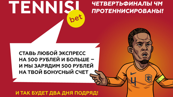 А теперь к бонусам. В пятницу и субботу за любой экспресс на 500 рублей и больше TENNISI bet пополнит ваш бонусный счет на 500 рублей. То есть, за каждый первый экспресс дня в пятницу и субботу можно набрать в сумме 1000 бонусных рублей!