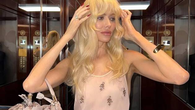 38-летняя манекенщица посетила показ бренда Fendi в рамках Недели моды в Милане. Она выбрала для мероприятия прозрачный пудровый топ без бюстгальтера, бежевую мини-юбку и пастельно-розовые туфли. Также знаменитость распустила уложенные волнами волосы, прикрыв лоб челкой, нанесла на ногти бордовый лак и сделала макияж в коричнево-розовых тонах.