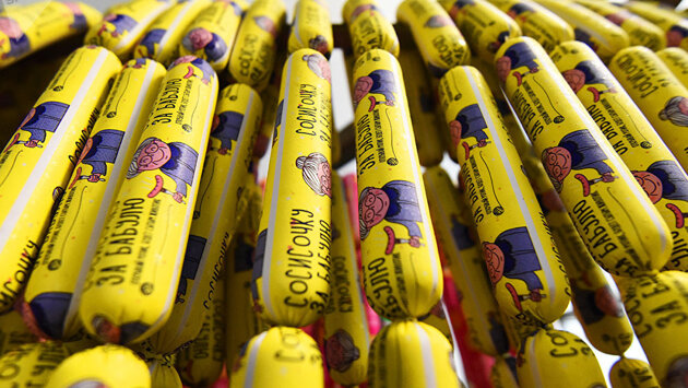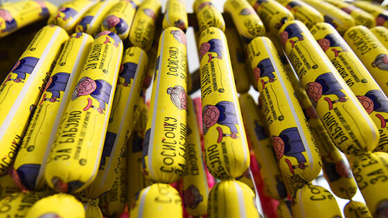 ГОМЕЛЬ, 7 окт — Sputnik. Новый вид сосисок в разноцветной оболочке под названиями "За мамулю", "За папулю", "За дедулю" и "За бабулю" запустили в производство на предприятии. Завоевывать рынок производитель намерен под слоганом "Сытые дети — довольные родители". Сосиски высшего сорта из линейки "за" в зависимости от состава имеют три цены. Самый дорогой — 7,7 рубля за килограмм — вариант из говядины и свинины. В остальные, более дешевые, добавлено мясо птицы и мехобвалки. Петр Комаров, оператор автоматической линии производства сосисок В торговую сеть новый гомельский деликатес поступит в вакуумной упаковке, которая вмещает все четыре вида сосисок "За!". В будущем, в зависимости от пожеланий покупателей, сосиски каждой серии в отдельности будут продаваться на вес. Понимая, что путь к сердцу покупателя лежит через полки супермаркетов, руководство мясокомбината первым делом устроило дегустацию представителям крупных торговых сетей. Те согласились, что у сосисок "За!" есть все шансы возглавить списки продаж. Осталась самая малость — подумать еще над снижением цены не в ущерб качеству. Первыми новинку попробовали представителям крупных торговых сетей "В сутки мясокомбинат отгружает в торговую сеть около 40 тонн колбасных изделий. В эту цифру входят поставки по всей Беларуси и за рубеж. Сотрудничество с магазинами идет по предварительным заявкам. На склад не работаем, а это гарантирует свежесть и качество продукта", — сделал акцент новый директор мясокомбината Сергей Корнеев.