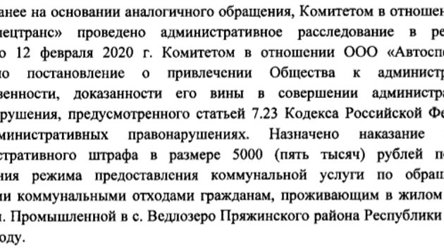 "Автоспецтранс" наказали рублём за нарушение режима оказания услуги в карельском селе