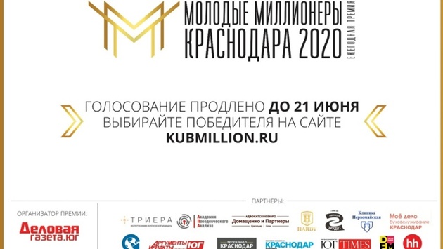 Онлайн-голосование в рамках ежегодной премии «Молодые миллионеры Краснодара 2020» продлено до 21 июня. Премия учреждена «Деловой газетой. Юг» в 2014 году с целью отметить молодых предпринимателей, показавших своим примером, что можно и нужно строить открытый бизнес в любое время. В премии участвуют учредители компаний и индивидуальные предприниматели в возрасте до 36,5 лет, бизнес которых зарегистрирован на территории Краснодарского края, показавшие по итогам 2018 года выручку от 3 млн рублей и чистую прибыль от 1 млн рублей. Участие в премии для номинантов бесплатное. Три победителя будут определены по результатам интернет голосования, а победители в специальных номинациях отобраны членами экспертного жюри. Победители получат внимание прессы и социума, а также призы от организатора и партнеров премии – доступ к программам, сервисам, особые условия обслуживания, рекламное сопровождение и другие опции, полезные для бизнеса. Онлайн голосование проходит на сайте. Организатор: «Деловая газета. Юг» Информационная поддержка: деловой новостной портал dg-yug.ru , журнал "Краснодар Magazine", Аргументы и Факты, еженедельник «Юг Times», Радиостанция DFM 106.0 Краснодар, сеть бизнес-порталов «ГлобалМедиа», телеканал «Краснодар», Гимназия «Эрудит». Официальные партнеры: Клиника «Первомайская», Клиника эстетической медицины «ТРИЕРА», Академия Поведенческого Анализа, Адвокатское бюро «Домащенко и партнеры», барбершопы HARDY, компания «Мое дело» Краснодар. HR-партнер: HeadHunter, hh.ru.