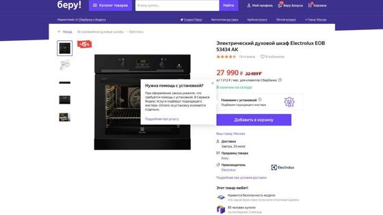 Пока услуга доступна жителям Москвы и Подмосковья. Как заказать установку: при оформлении заказа на сайте маркетплейса выбрать опцию «Мне нужна помощь мастера». После оформления информация о заказе передается партнеру Яндекс.Услуг, который связывается с клиентом, уточняет детали по заказу и согласовывает дату визита мастера. Установка техники оплачивается наличными на месте после оказания услуги. Мастер составляет акт об оказании работ и выдает чек. На работу мастера действует гарантия 1 год. Если в ходе установки оказалось, что техника бракованная, то клиент не платит за выезд сотрудника. Можно заказать установку водонагревателей, измельчителей, посудомоечных машин, стиральных и сушильных машин, любой встроенной бытовой техники (духовые шкафы, варочные панели, холодильники, морозильники, винные шкафы). Цены на услуги находятся в диапазоне от 1,1 тысячи рублей до 10 тысяч рублей в зависимости от вида техники. Маркетплейс «Беру» входит в «Яндекс.Маркет», который до недавнего времени вместе развивали Сбербанк и «Яндекс». В конце июня партнеры объявили о разделе совместных проектов. Сбербанк выкупит у «Яндекса» долю в сервисе «Яндекс.Деньги» за 2,4 млрд рублей. В свою очередь, «Яндекс» выкупит долю Сбербанка в «Яндекс.Маркете» за 42 млрд рублей.