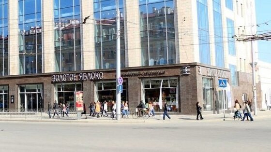 Общая площадь здания, согласно данным Росреестра, — 11,26 тыс. кв. м, и лишь 1,5 тысячи из них на первом этаже занимает "Золотое яблоко" — остальные пустуют.