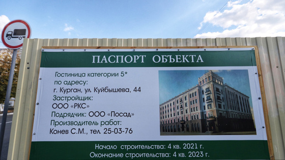 «Гостиница категории 5* по адресу г. Курган, ул. Куйбышева, 44. Застройщик: ООО „РКС“. Подрядчик: ООО „Посад“», — указано в паспорте объекта, передает корреспондент URA.RU.