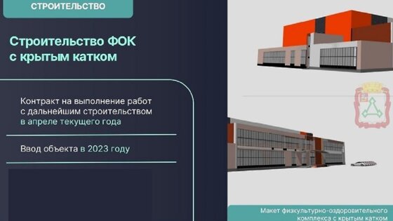 Помимо крытой ледовой арены со зрительскими трибунами, в составе нового спортивного объекта будут тренерские, раздевалки, душевые, медицинский блок, а также вспомогательные и административные помещения. Территория вокруг ФОКа будет благоустроена и озеленена. Отмечается, что срок сдачи объекта - 2023 год.