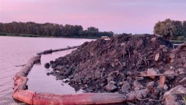 На предоставленных редакции фотографиях видны следы недавних земляных работ, экскаватор, металлические конструкции и разводы нефтепродуктов на береговой линии.