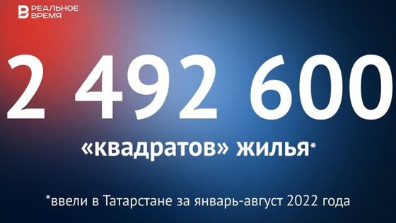 По 311 575 "квадратов" жилья в месяц.По 1,56 "квадрата" жилья на каждого жителя Татарстана — в республике на начало 2022 года проживало более 3,88 миллиона человек. В среднем почти по 205 "квадратов" на один дом — в Татарстане за январь — август построили 12 172 дома.49 852 квартиры — по данным Единого ресурса застройщиков, средняя площадь жилой единицы в России составляет 50 "квадратов".53 ИТ-парка имени Башира Рамеева — площадь объекта, открытого в Казани в День республики, превышает 47 тысяч кв. метров. 19 новых детских парков в Казани — отведенная под его строительство площадь территории парка Победы составляет 13 га. Площадь 26 участков бывших промышленных зон Москвы, которые решили комплексно развивать по проекту "Индустриальные кварталы", — на более 249 га появится более 4,2 млн квадратных метров недвижимости.Почти 11 жилищных фондов, построенных в Мордовии за январь — июль 2022 года, — за восемь месяцев ввели 232 тысячи кв. метров жилья. Меньше четверти от возведенного за январь — август 2022 года в Московской области — там построили 10,57 миллиона "квадратов" жилья.82,7% от площади жилья, введенного в Татарстане в 2021 году — в республике построили 3,01 миллиона кв. метров. 1,34 раза больше, чем за восемь месяцев 2020-го — за январь — август "пандемийного" года в Татарстане возвели 1,85 миллиона кв. метров жилья.В 1,5 раза больше, чем за январь — август допандемийного 2019 года — в Татарстане за этот период построили 1,66 миллиона "квадратов" жилья. На 82,7 тысячи "квадратов" больше, чем за весь 2018 год — в Татарстане тогда ввели в эксплуатацию 2,409 миллиона кв. метров жилья.