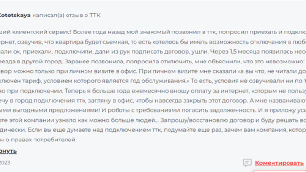 Свердловчанка планирует обратиться в прокуратуру, чтобы ведомство проверило законность действий провайдера. Тем более, что на официальном сайте ТТК есть и другие клиенты, с кого также требуют деньги за расторжение договора. URA.RU отправило запрос на почту компании, но на момент публикации ответ не поступил.