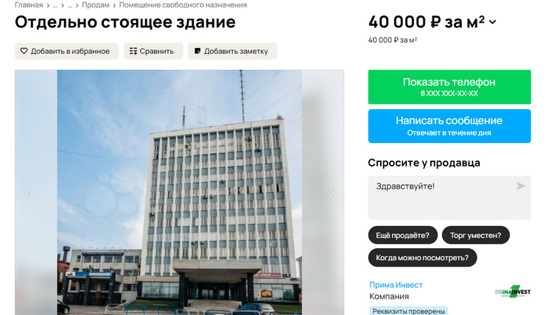 «На продаже офисное здание в центре города, р-н ЖД вокзала. <…> 10 этажей <…> площадь каждого этажа от 430 до 480 кв.м», — написано в объявлении на сайте «Авито». Площадь здания — 4500 квадратных метров. Стоимость одного квадратного метра — 40 000 рублей, указано в объявлении. Итого общая стоимость объекта составляет 180 миллионов рублей.
