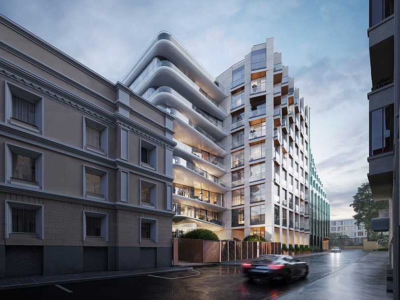 Здание с архитектурой от бюро ADM гармонично вписано в исторический облик района. Каждый из фасадов — белый глянцевый с плавными консольными террасами, выступающими на 4 метра, каменный с волновой пластикой балконов и полностью стеклянный — имеет индивидуальное художественное решение.