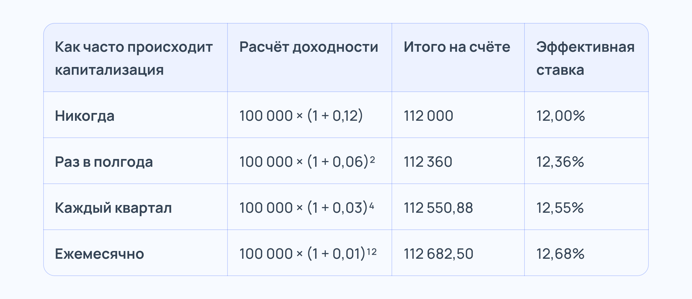 То, сколько раз банк добавляет проценты к телу вклада, прямо влияет на его доходность. Чем чаще это происходит, тем быстрее она растёт. Сравним несколько вариантов на примере тех же 100 тысяч рублей под 12% годовых сроком на 1 год.