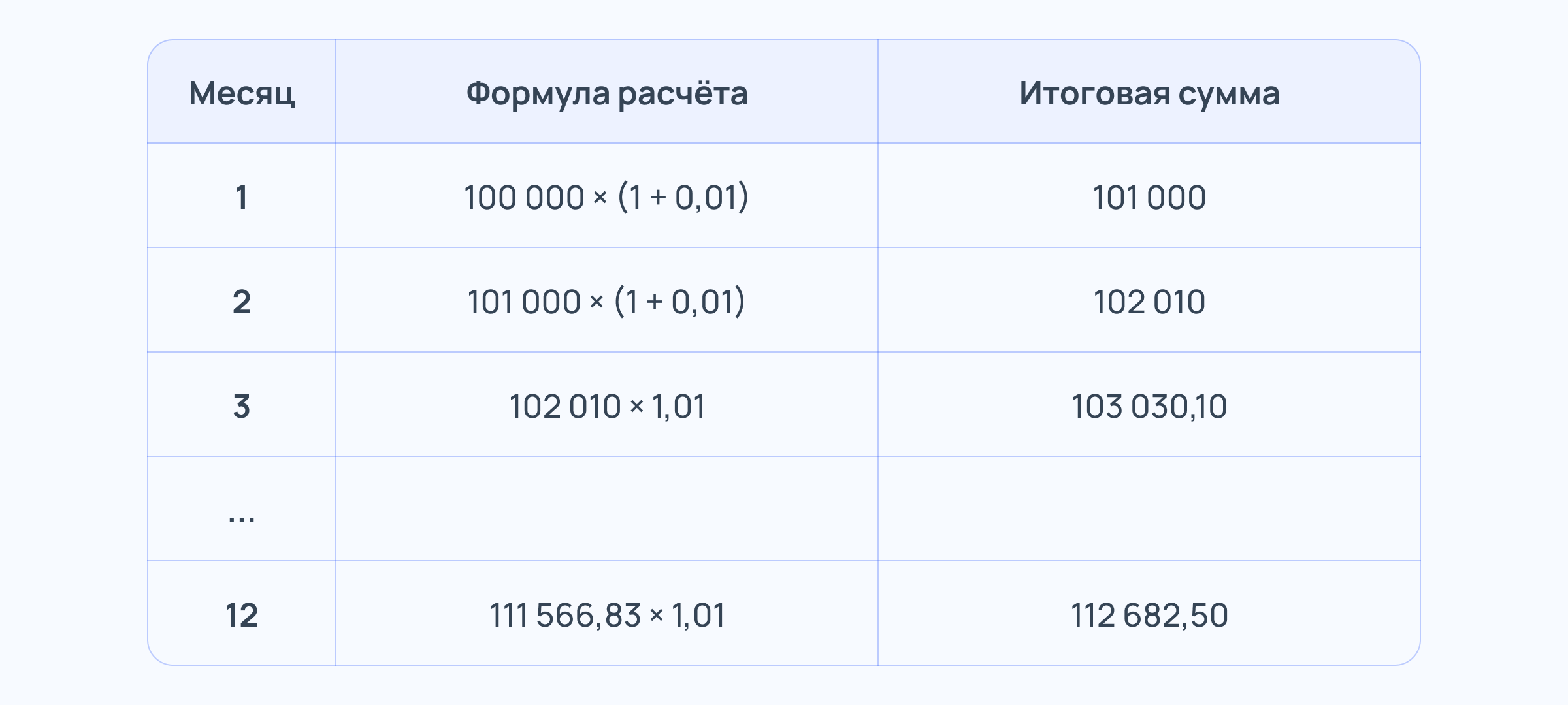 Пример. Представьте, что вы положили на счёт 100 тысяч рублей. Ставка по вкладу — 12%. Капитализация происходит каждый месяц. Тогда через месяц вам начислят примерно 1% (1/12 от годовой ставки) — это 1000 рублей, и на счёте будет 101 000 рублей. В следующий раз проценты выплатят уже на них, и вы получите 1010 рублей.