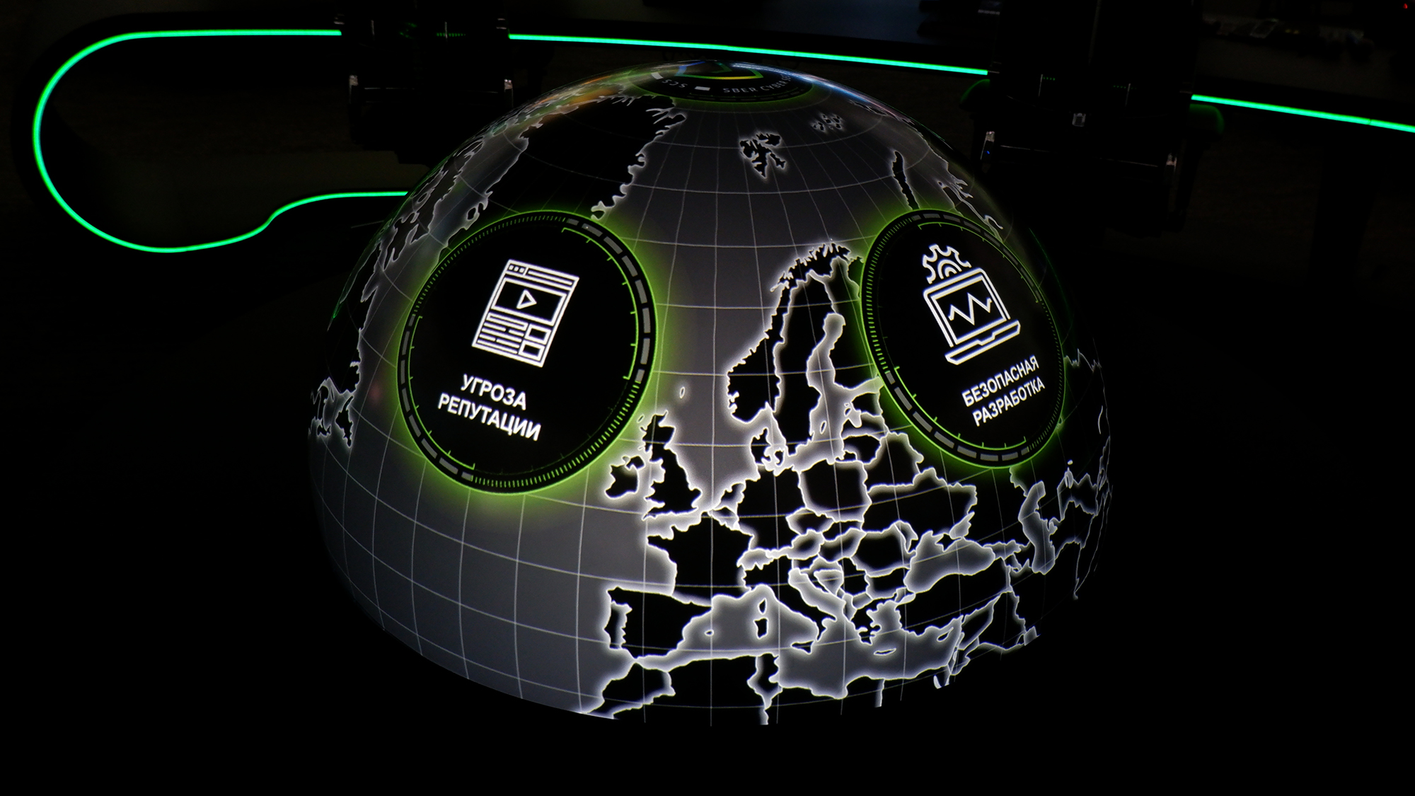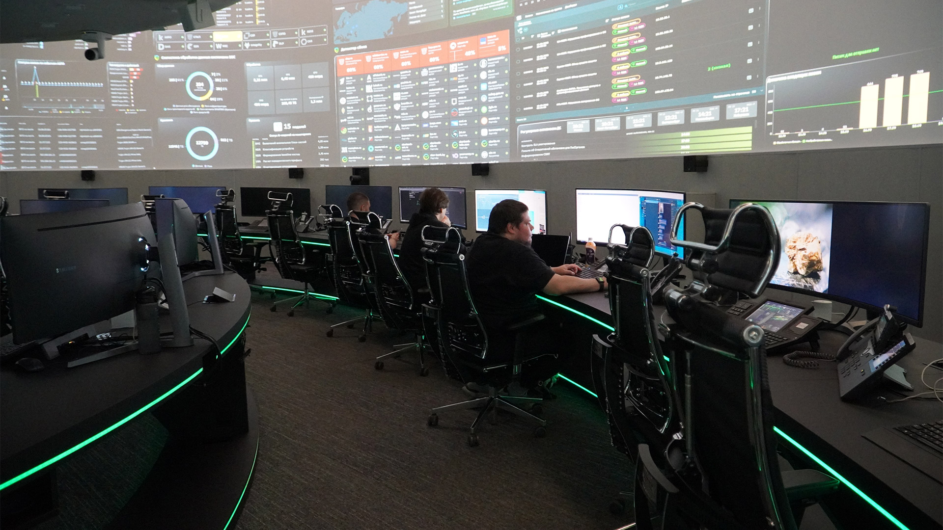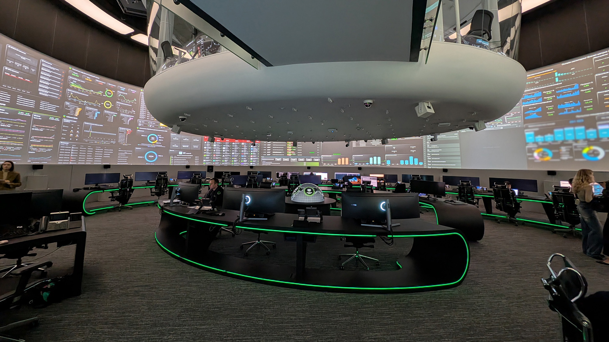 В сердце Центра — зал с полусферическими стенами, на которых мигают экраны с таблицами, графиками и картами. Посетители нередко сравнивают его со «звездолётом» или «центром управления полётами». И действительно: вокруг десятки экранов, которые позволяют отслеживать кибербезопасность в реальном времени.